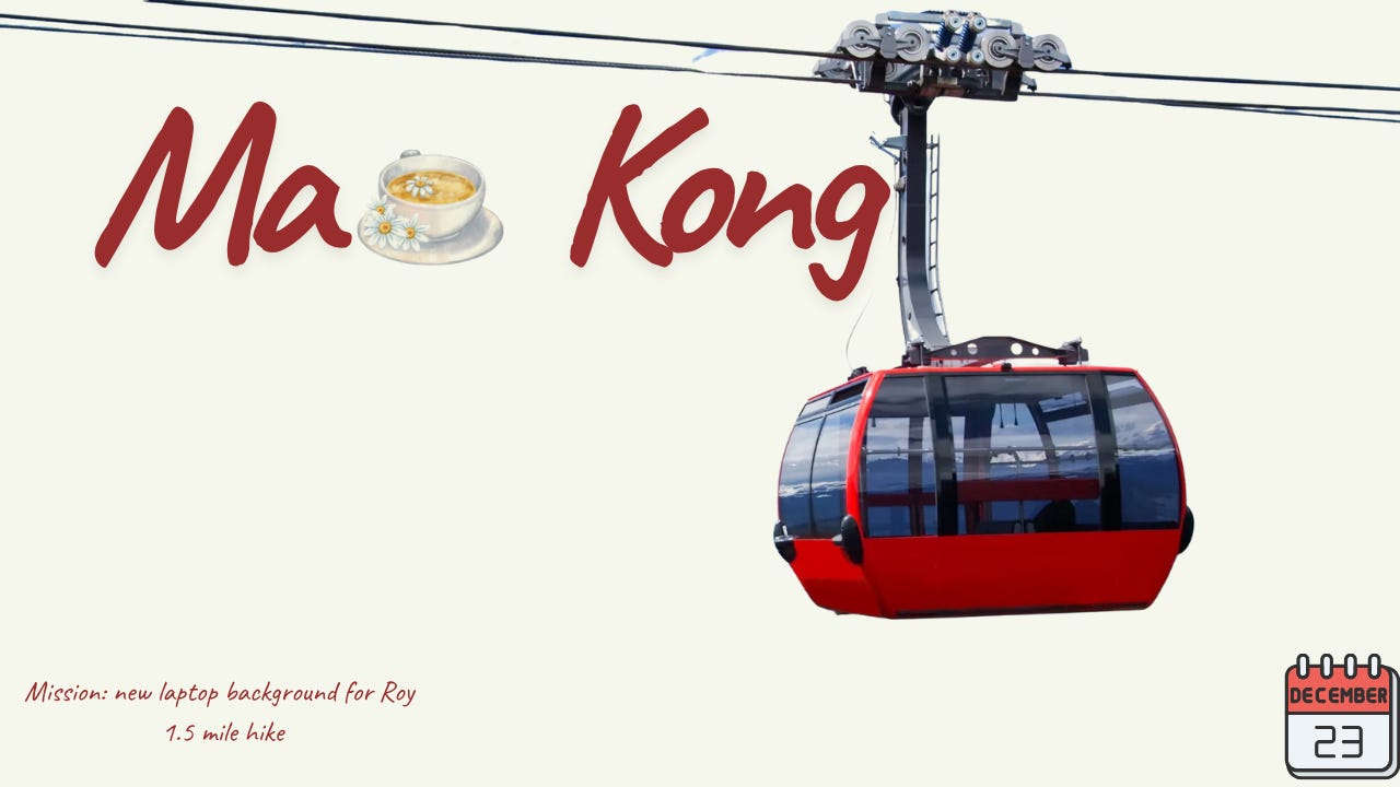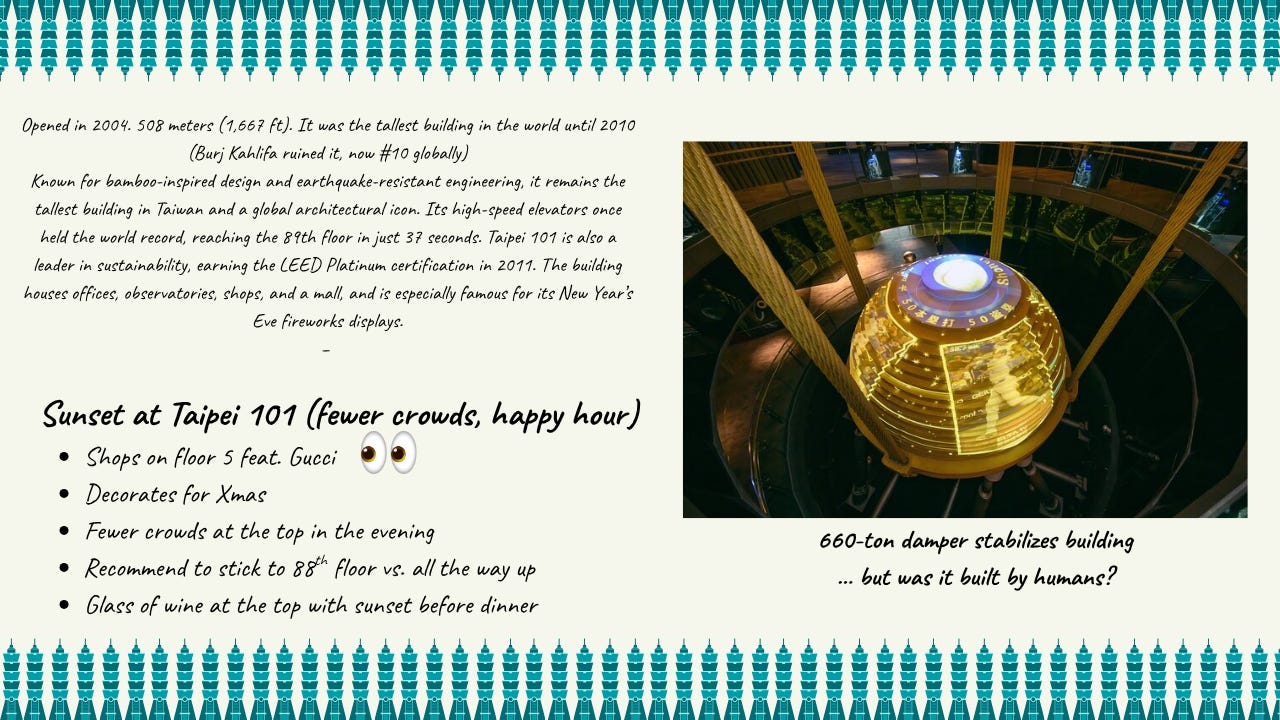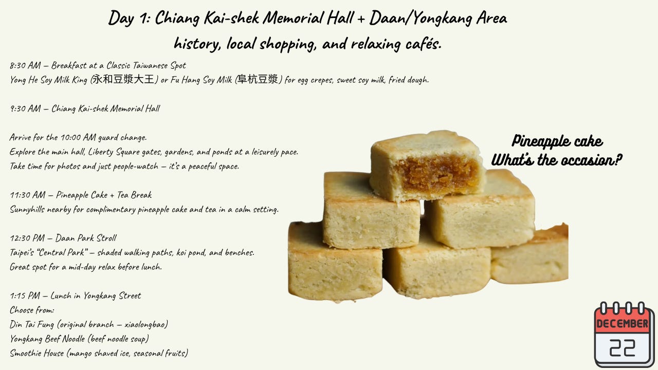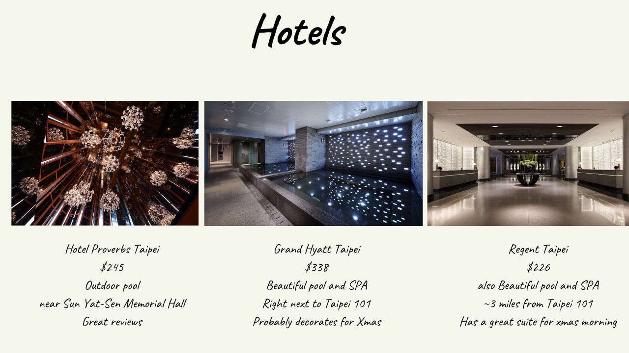 I got lucky—my parents will be in Taipei during our visit. Christmas this year will be spent with a confusing but exciting mix of my parents, Roy’s brother, and our Taiwanese sister-in-law. Naturally, I made a PowerPoint.